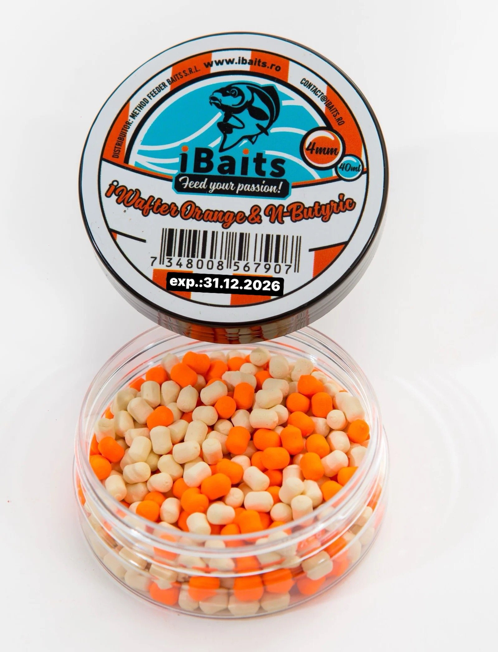 Noile momeli iBaits iWafter de 4 mm sunt momeli de tip wafter, critic echilibrate, în formă de dumbell (butoiaș), ce au diametrul de 4mm, doua culori in aceeasi cutie, capete rotunjite care ajută momeala de cârlig să poată fi atașată extrem de ușor pe firul de păr, pe banda siliconică, pe quick stops sau pe spinul de momeală.